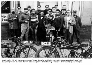 In den 20er Jahren des 20. Jh. wurde das "Sensationsangebot" im Rahmen der Radsportveranstaltungen durch "Motorradrennen" zusätzlich erwei-tert. Schon auf der Bahn im Sportpark Brandenburg an der Havel begann man wenige Jahre nach seiner Eröffnung im Anschluss an die Steherrennen ein sogenanntes "Vergleichsfahren, Testfahren oder Zuverlässigkeitsfahren" der besten Schrittmacher (Motoren) abzuhalten. Waren die Schrittmacher bis dahin "beim Spielen am Gashahn" immer durch die Leistungskraft der von ihnen im Windschatten "gezogenen" Radrennfahrer limitiert, konnten sie in diesen, zunächst nur als Zugabe gedachten Veranstaltungen, ohne "lästiges Anhängsel", nun ihrem "Affen richtig Zucker geben"! Die Motorhersteller sahen das natürlich gern, hatten sie doch ohne den Bau von Übungsstrecken mit eigenem Geld die beste Testung ihrer Fabrikate vor den Kunden von Morgen. Und eines schien klar, dass viele dieser jubelnden jungen Männer den lästigen Umweg über die Fortbewegung eines schicken Zweirades durch mühsame Muskelkraft und lästiges Training derselben erst gar nicht mehr ausprobieren wollten.