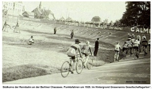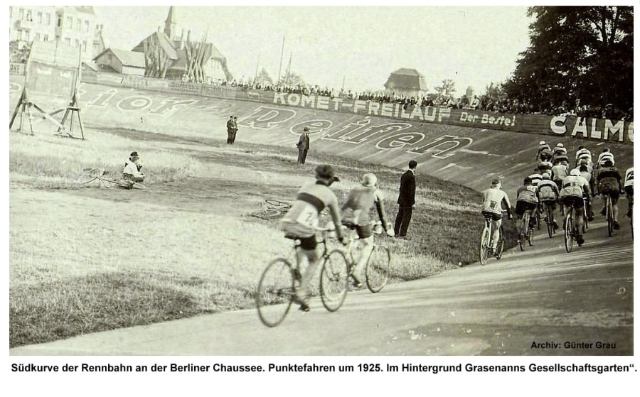 Hier füge ich noch einen mir interessant erscheinenden Aspekt über die Radrennbahn ein, welchen ich anhand meiner Unterlagen bisher chronologisch noch nicht ganz schlüssig einordnen konnte. Das alte Foto von 1906, welches mir G. Grau dankenswerter Weise zur Verfügung gestellt hat, kann da wohl weiterhelfen.