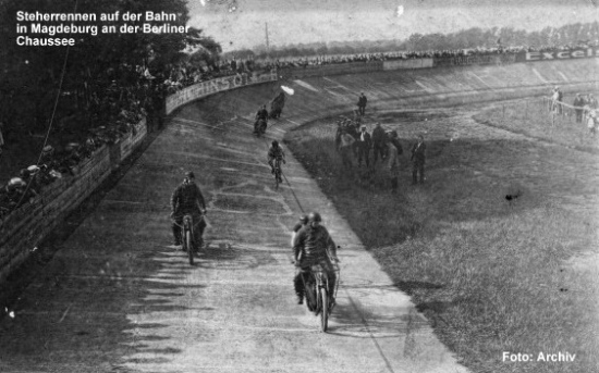 Namen der Initiatoren des Projektes Radrennbahn an der Berliner Chaussee, welche den Bau „angeschoben und umgesetzt“ haben, sind mir nicht bekannt. Die Ideen kamen sicher aus den führenden Vereinen. Radrennbahnen in Deutschland sind meistens von Konsortien solventer Unternehmer aus rein wirtschaftlichem Interesse erbaut und dann an geeigneten Betreiber verpachtet worden, die kauf-männisch in der Lage waren, solch Unternehmen gewinn-bringend zu führen. Dazu gehörte sicher auch damals eine gute Vernetzung im "Radsportzirkus", wie es wahrscheinlich heute in der Formel 1 üblich ist. Im Profi-Bereich standen die bekannten Fahrer auch meistens bei Managern (Vermittler oder Agent) unter Vertrag, welche die Termine koordinierten und nach den besten Preisgeldern Ausschau hielten. Das galt besonders für Fahrer mit einem „großen“ Namen, die möglichst Deutsche, Europa- und/oder Weltmeister waren und dann auf den Vorankündigungen als Attraktion präsentiert werden konnten. Das brachte Warteschlangen an den Kassenhäuschen. Häufig waren es die Steher-rennen mit ihrem ohrenbetäubenden Lärm, welche besonders die männliche Jugend begeisterten. Männer mit klangvollen Namen, wie z.B.: Thaddäus Robl-München, Carl Saldow-Berlin, A. Dickentmann und H. R. van Schoonthoven-Amsterdam waren vor dem 1. Weltkrieg sicher häufig am Start. Für besonders gute Stimmung auf den Rängen sorgte immer ein starker Lokalmatador, wie Gustav „Pepi“ Brummert, den die ungarische Presse einmal als „Teufelsfahrer“ aus Magdeburg beschrieb, mit seinem Schrittmacher Walter Jungnickel oder der Sprinter Otto Michaelis sen., welcher der hochdekorierten auswärtigen/ausländischen Konkurrenz Paroli bieten konnte. Dann schäumte das Stadionrund fast über, und der Lokalpatriotismus konnte voll ausgelebt werden.