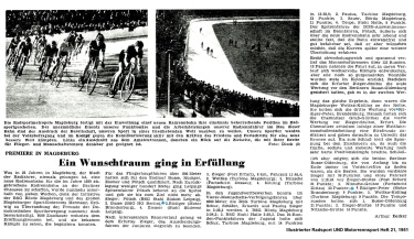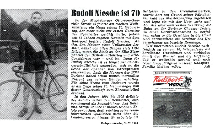 Für den Sportpark in Brandenburg ab 1899 habe ich einige aus der Riege der Betreiber beschrieben. Zunächst versuchten die einheimischen „Erbauer“ das „Konstrukt“ selbst zu vermarkten, merkten aber bald, dass dafür Leute mit spezifischen Qualifikationen nötig waren. Meistens hatten diese Männer in jungen Jahren selbst etwas mit dem Radsport zu tun. Ein ehemaliger Bahnradsportler und späterer Unternehmer aus Berlin, Willy Lücke, den es nach Brandenburg verschlagen hatte, leitete vor dem 1. Weltkrieg einige Jahre die Brandenburger Bahn und 1913 auch parallel die Bahn in Magdeburg. Dann kam überall die 4 – 6jährige „Flaute“ durch die Kriegswirren des 1. Weltkriegs, in der Radsportveranstaltungen, auch in der Berichterstattung, faktisch keine Rolle mehr spielten. In einem gemeinsamen öffentlichen Nachruf für die 1972 verstorbenen Veteranen Walter Jungnickel und Hans Kaps, wird Letzterer als früherer „Rennbahndirektor“ benannt, jedoch nicht in welchem Zeitraum. Vom Alter her könnte er in Nachfolge von Willy Lücke gewesen sein. Danach hat ein Magdeburger mit eigenen Radsportwurzeln, der inzwischen ein solventer Unternehmer in seiner Heimatstadt geworden war, ab 1921 die Rennbahn betrieben. Rudolf Niesche (1890 -1969) besaß eine Vulkanisieranstalt in der Kaiserstraße, heutigen Otto-von-Guericke-Straße. Im „Der Radsportler 1960“ wurde ihm anlässlich seines 70. Geburtstages öffentlich gratuliert. (siehe Bild oben). Ihm folgte dann offenbar 1923 bis 1929 der gebürtige Magdeburger, Otto Schmidt(*1892), auch ein ehemaliger Radsportler. 1908 hatte er sein erstes Straßenrennen, „Magdeburg-Weferlingen-Magdeburg“ gewonnen, fuhr später auch Bahnrennen, ohne jedoch Spitzenfahrer zu sein. Sein Talent lag im organisatorischen Bereich. So war er auch zeitweise Vereinsvorsitzender des 1908 gegründeten „RC Triumph“ und von 1929 bis 33 des „RC Endspurt“ Magdeburg. Er leitete die Rennbahn bis zu deren unaufhaltsamen Ende 1929, was ihn sicher auch sehr betrübte. Seiner Initiative soll es zum großen Teil zu verdanken gewesen sein, dass draußen vor den Toren der Stadt im kleinen Ort Biederitz eine kurze Zementpiste entstand, auf der sich die Magdeburger noch bis in die 60er Jahre der DDR-Zeit tummeln konnten. Aber auch deren Ende war dann nicht mehr aufzuhalten. Nach dem 2. Weltkrieg war auch er „Mann der ersten Stunde“, baute ab 1951 gemeinsam mit Alfred Rommel den Amateur-Dauerrennsport wieder auf, war erster BFA-Vorsitzender in Magdeburg und engagierte sich auch stark bei der Organisation der Internationalen Friedensfahrt Ende der 50er Jahre.