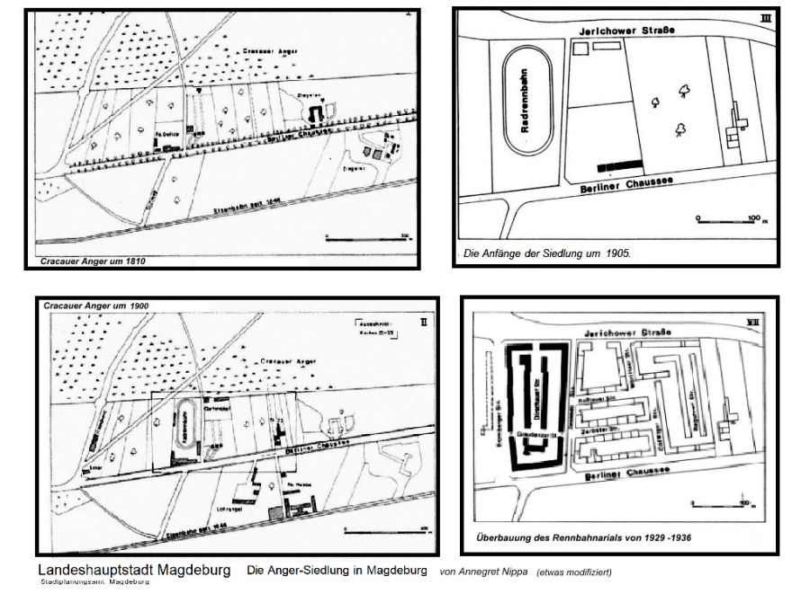 Diese Straße ist ein Teilstück der alten Reichsstraße von Königsberg nach Aachen, die von Berlin über Brandenburg a. d. Havel, Genthin und Burg kommend Magdeburg als Bundestraße 1 von Ost nach West in Richtung Helmstedt und Braunschweig durchquert. In einer Broschüre des Stadtplanungsamtes Magdeburg findet sich in einem sehr informativen Aufsatz über die Entwicklung von Angersiedlung und Brückfeld eine interessante Beschreibung der Entwicklung dieses Areals unter spezieller Berücksichtigung der Radrennbahn, auch anhand von kurzen Lageplänen im Verlauf des kurzen 33jährigen Bestehens dieser Freizeit- und Sportanlage (s. Abb.). Auf der Fläche zwischen der heutigen Dessauer und der Georg-Heidler-Straße baute man diese Rennbahn, welche dann zwischen den Restaurants „Zum Goldenen Rad“ und „Grasemanns Gesell-schaftsgarten“ gelegen war. Das erste Rennen auf dem 400 m langen Zementoval mit 3 Meter überhöhten Kurven fand am 30. März 1897 statt.