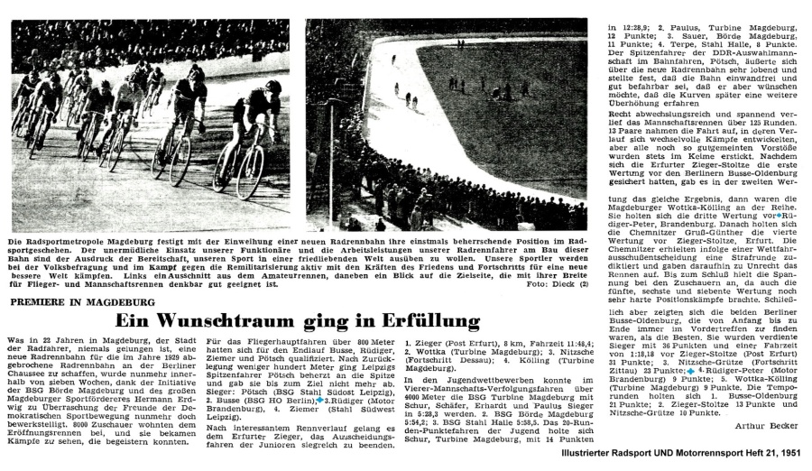 Auch die Radsportler der Stadt Magdeburg hatten keine richtige Radrennbahn mehr nach dem Untergang der alten, an der Berliner Chaussee. Auf Initiative, u.a. von Otto Schmidt, war nach 1929 in Biederitz, vor den östlichen Toren der Stadt, eine kurze Zementpiste erbaut worden, worauf sich die Magdeburger Akteure tummeln konnten. Über nachgewiesene Aktivitäten aus den 30er (Lipfert/K.Müller) habe ich berichtet.
