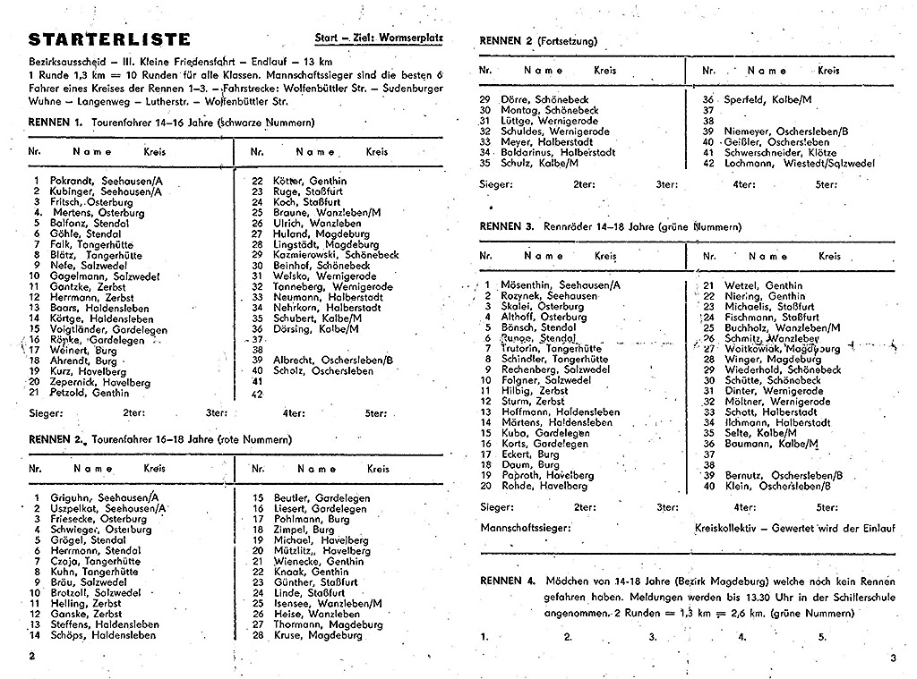 Insgesamt habe ich 13 solcher Rennen bestritten. Einmal fuhren meine Eltern mit mir sogar nach Venusberg in Sachsen, wo die sogenannte Weltmeisterschaftsrevanche als "Gr. Preis der Deutschen Sportechos" stattfand. Sieger wurde damals Bernhard Eckstein.