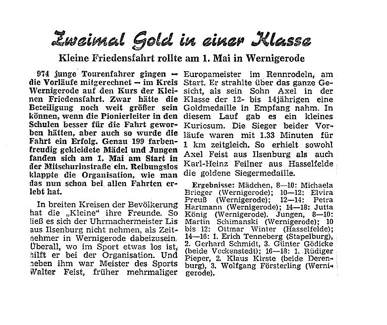 Sehr überrascht war ich schließlich auch bei der Lektüre des Buches "Kluge Köpfe, schnelle Beine" des Sportjournalisten und Buchautors, Klaus Ullrich. In der Mitte desselben fand ich eine ein-seitige Fotografie, auf der meine Mutter und ich abgelichtet waren. Diese Aufnahme entstand beim regnerischen Bezirksentscheid der Kleinen Friensfahrt in Magdeburg 1962 im Rothehorn-Park.