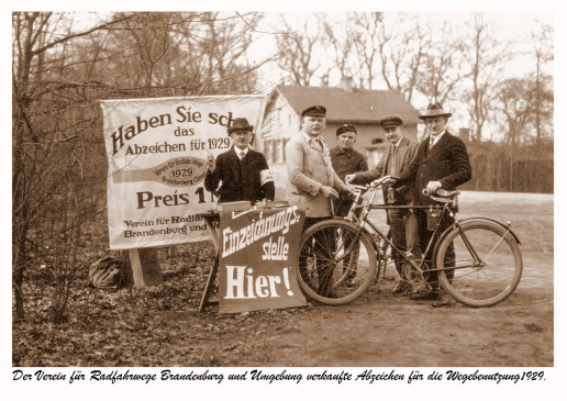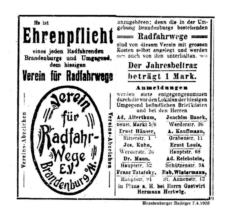 BA., Nr.81,So., 5.4.1930: Verein für Radfahrwege hält seine Jahreshauptversammlung ab. U.A. soll ein neuer Radweg nach Wust entlang der Bahn angelegt werden. Es wird gefordert, dass die Stadtbehörden darauf hinwirken, dass Fußgänger, Motorräder und Handwagen nicht mehr die Radwege benutzen.