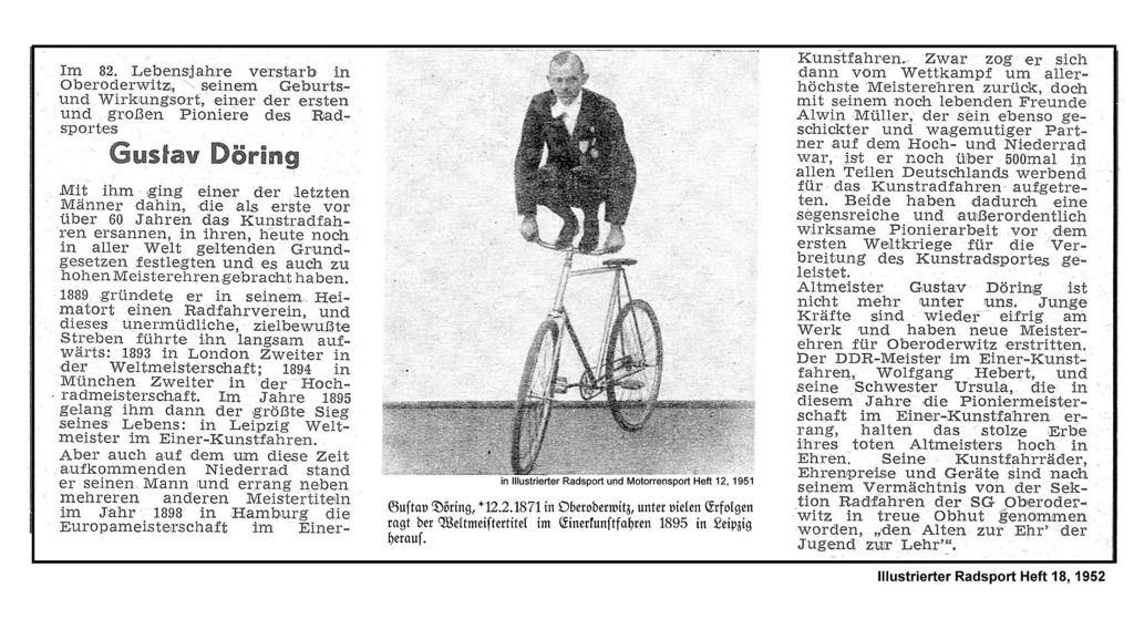 BA., Nr.161 am 14. Juli.1891: Das Gäste-Rennen des Radfahrer-Vereins „Vorwärts“ bei Plaue verlief trotz strömenden Regens pro-grammmäßig. Sie gestalteten sich interessant, denn die Niederräder mit Hohlgummi (*reifen) erwiesen sich als gefährliche Gegner, und es konnte sich der vorzügliche Hochradfahrer Fischer nur mit einer Radlänge an der Spitze behaupten. Fünf Rennen wurden ausgetragen mit jeweils 3 Startern: