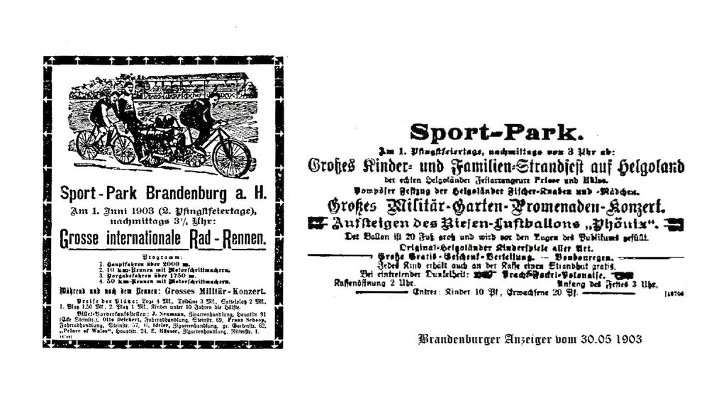 Anfang März 1927 stellte der Brandenburger Renn-und Tourenklubs „Endspurt“ 1913 sein Jahres-Sportprogramm vor: Neben 10 Radrennen waren auch verschiedene Tourenfahrten geplant, wie z.B.: Herrentour nach Bohnenland, Tourenfahrt nach der Burg Rabenstein, Fahrt in Wörlitzer Park, eine Nachttour.