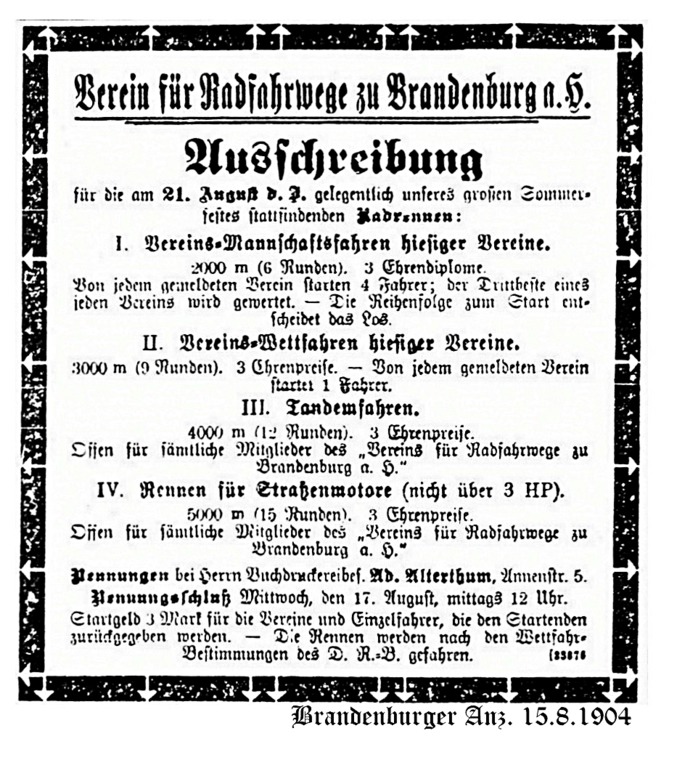 In Brandenburg sammelten sich solche Talente besonders im Radfahrer-Verein "Vorwärts" von 1887, Radfahrer-Verein "Brennabor" von 1891 und dem Touren-Rennradfahrer-Verein von 1896.