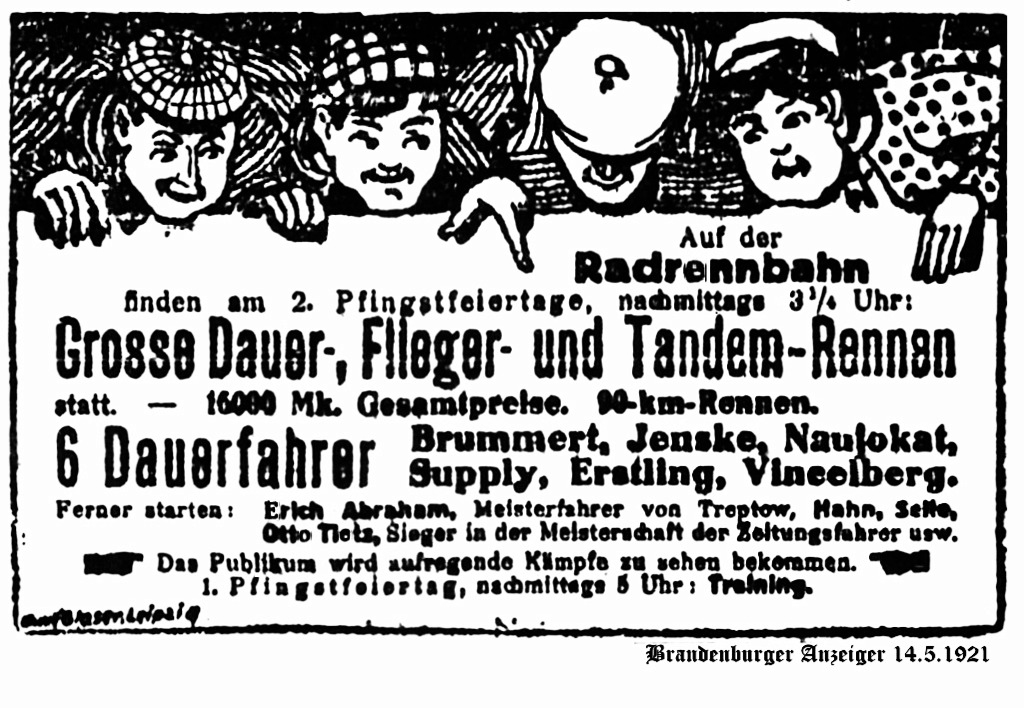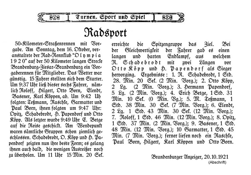Radrennen in Nowawes: Der R.V. Möwe Nowawes, veranstaltete sein zehnjähriges Bestehen mit einem Radrennen über 118 km für Männer und 50 km für die Jugend. Am Hauptrennen beteiligten sich etwa 100 Fahrer. Aus Brandenburg/Havel waren vertreten: Otto und Paul Marschall, Räsener, Piede vom V.B.R. 1910, Müller von R.R.C. Endspurt 1913 und der Jugendfahrer Georg Gräbitz von Endspurt. Ergebnis: 1. Otto Marschall …….. 3. Platz trotz Sturzes, Piede 14 bei seinem ersten Rennen in der C-Klasse.