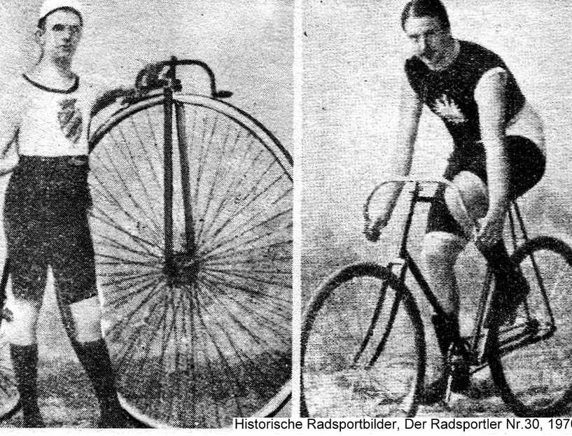 Radsportgeräte der damaligen Zeit. Zunächst kamen ab 1868 das Hochrad und Tretkurbelrad zum Einsatz. Später ab 1887 wurde zunehmend und bald ausschließlich das Niederrad gefahren. Abb. zeigt den ersten Deutschen Weltmeister August Lehr aus Frankfurt a.M